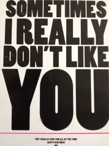This was my card from B. The small print says…But I really love you all of the time. Happy Birthday. Me. X. I won’t pretend it didn’t piss me off at first. It did. But actually, it was the perfect card. We have both been pissing each other off the last couple of days, just normal couple crap. And it is normal. To have crap I mean. This is the world we live in. Not in the other world that many only share. The world that makes you look at your normal relationship filled with good and crap and wonder what’s wrong with you. Why can’t you be so in love and nauseatingly happy all the time too. Nothing is wrong with you. As long as you are honest. So, if any of you have felt envious of B and I because we have the most fabulous of relationships. Don’t. We don’t and I honestly don’t believe they exist. Not if you are truly honest with yourselves and the real world. But, if you want to envy our honesty. You can. Because of that I am proud. It is what it is. Life is what it is. I wish people would just stop pretending. So, I love my card. It is honest. A schmaltzy we are so fabulous aren’t we and you are the best person on the planet card, would not have been. I don’t like B some of the time either, but I do love him, yes, all of the time.