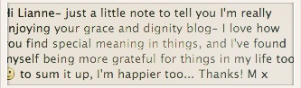 16 November. I am grateful for a distracting girls night out. A welcome distraction because B and I decided to walk away from the house purchase due to an impasse on various issues. So I am grateful for a fun end to a not fun day. For meeting new friends and getting to know old friends better. For sharing and for perspective. And for gratitude at being reminded once again how blessed I am.