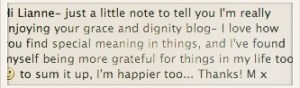 30 December. I am grateful for a trip down memory lane and for worlds colliding, a Melissa’s in Parkhurst. Perfection. I loved living in Parkhurst. But I still don’t get why they painted our crisp white wall dog poo brown. Not that I care. But seriously, what were they thinking. I guess there is no going back.